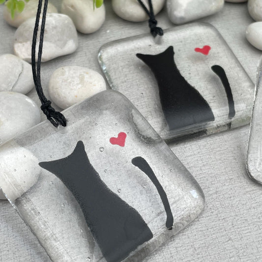 Love Cats - fused glass keepsake token of a black cat and love heart