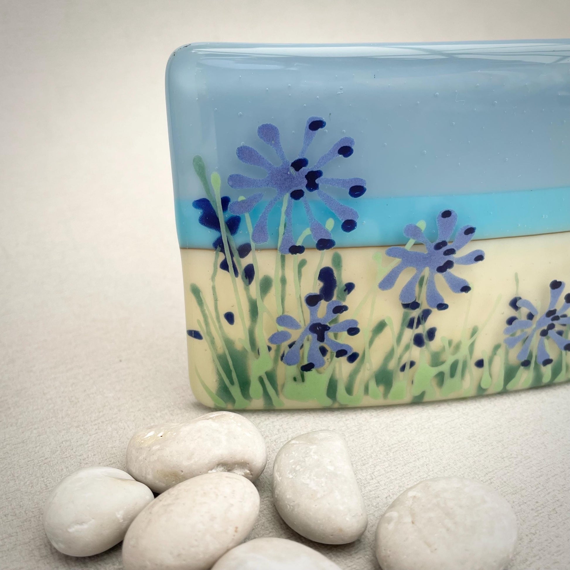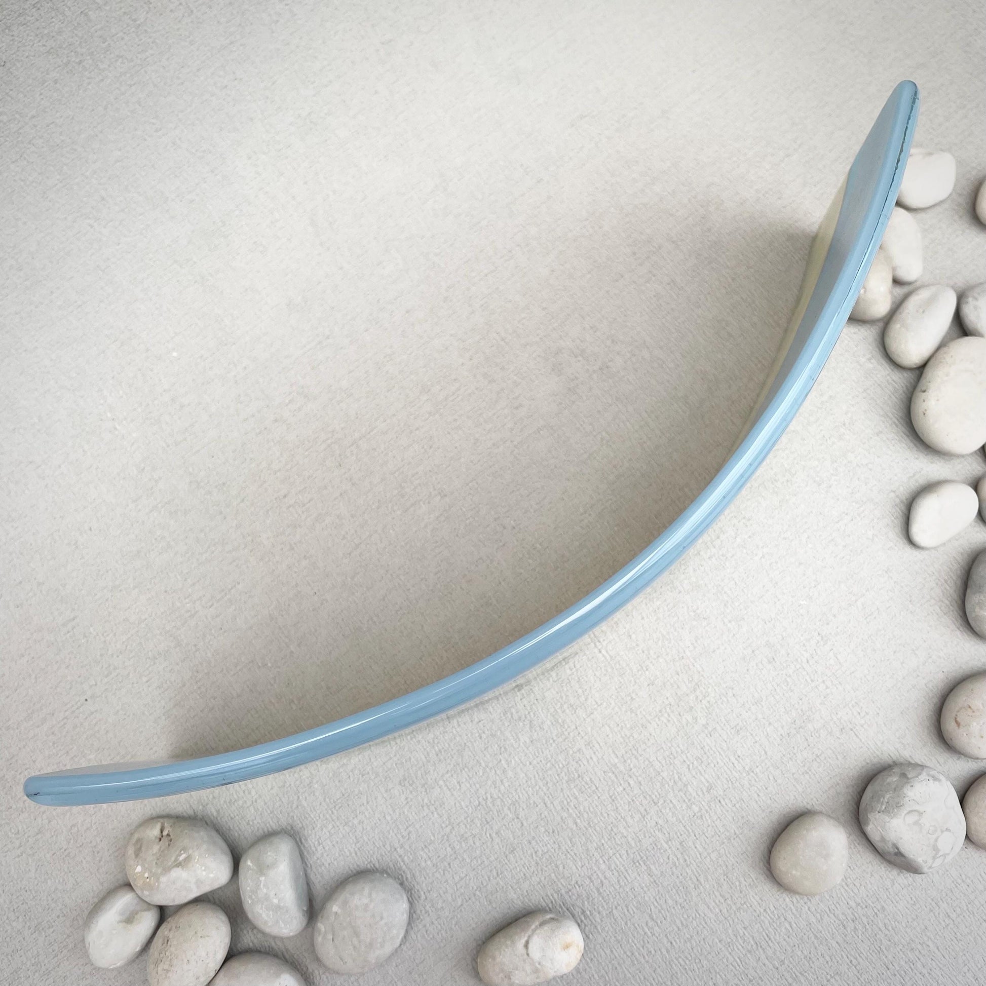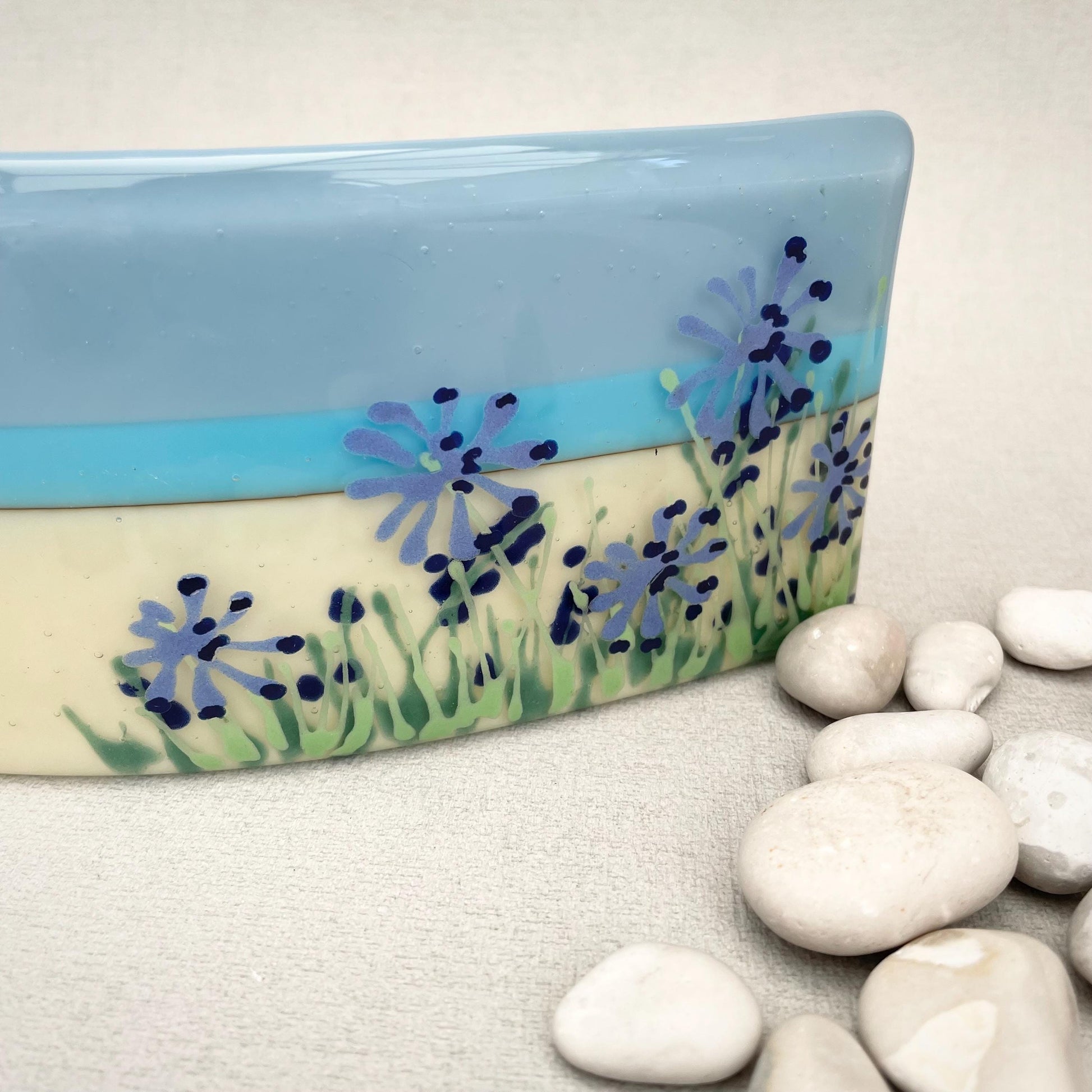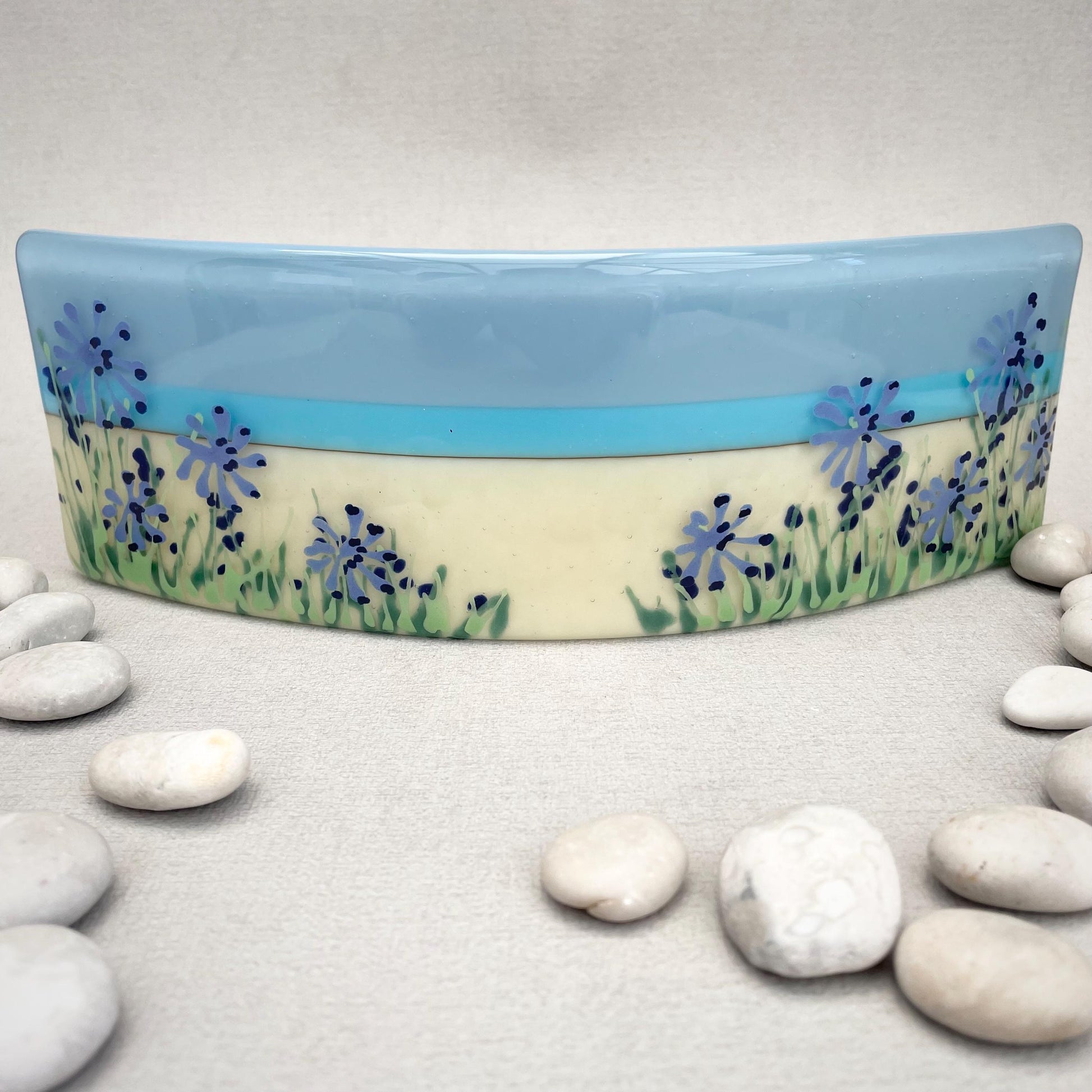 A hand painted, free standing curve in cool shades of sandy beaches & clear blue ocean. Looks beautiful anywhere in your home, but as an opaque glass, it doesn’t depend on being very well lit like a transparent glass, so it will look equally fabulous on a shelf or mantle for example.