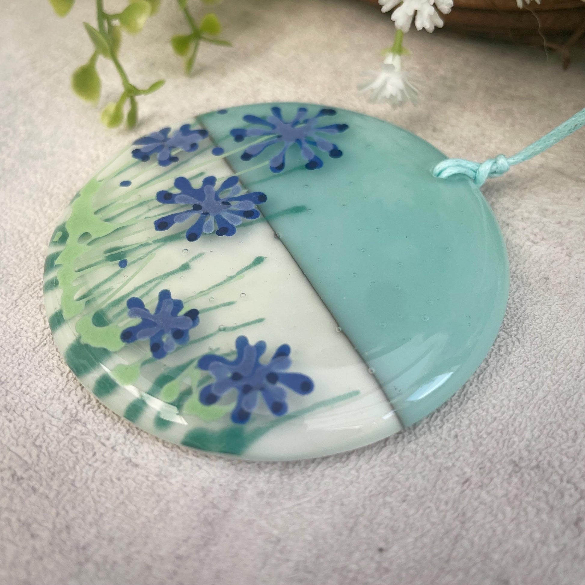 Wild agapanthus growing on a sandy beach shoreline, a hand painted little glass hanger reminiscent of summer holidays by the sea.