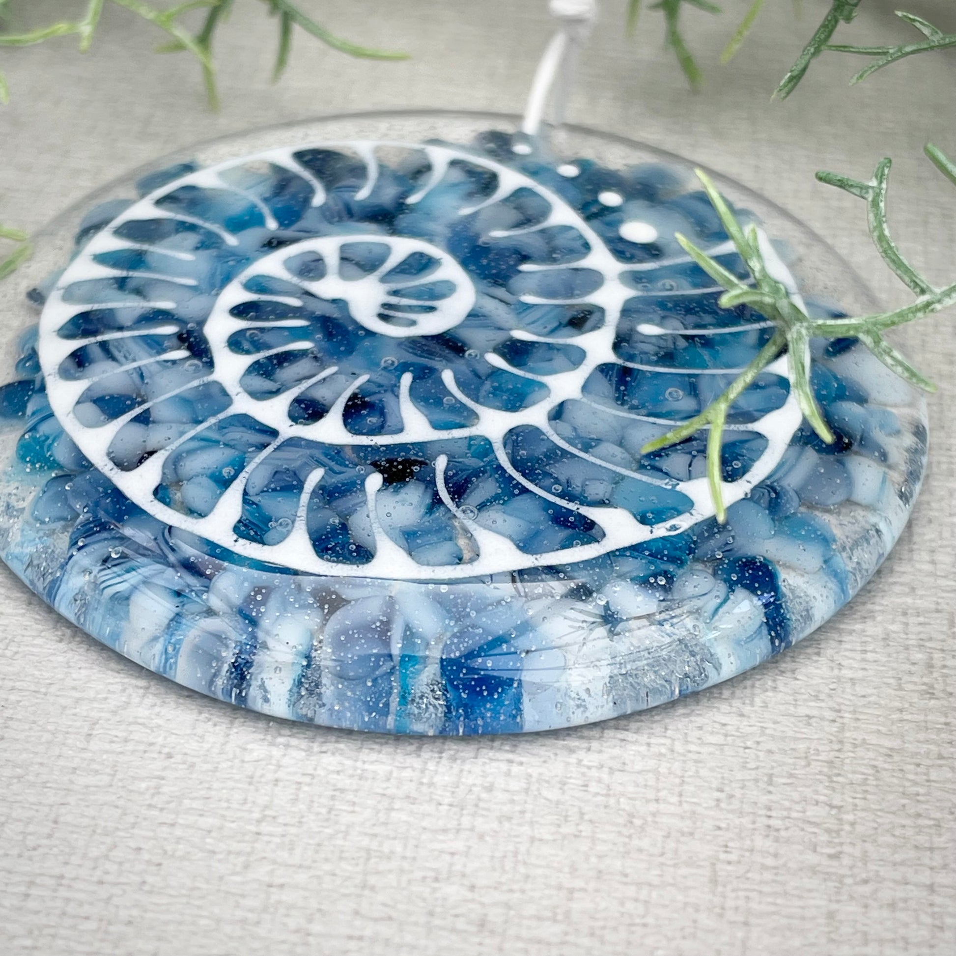 Fused glass ammonite decoration ~ made with crushed reclaimed glass and individually hand painted, each one of these hangers are completely unique.