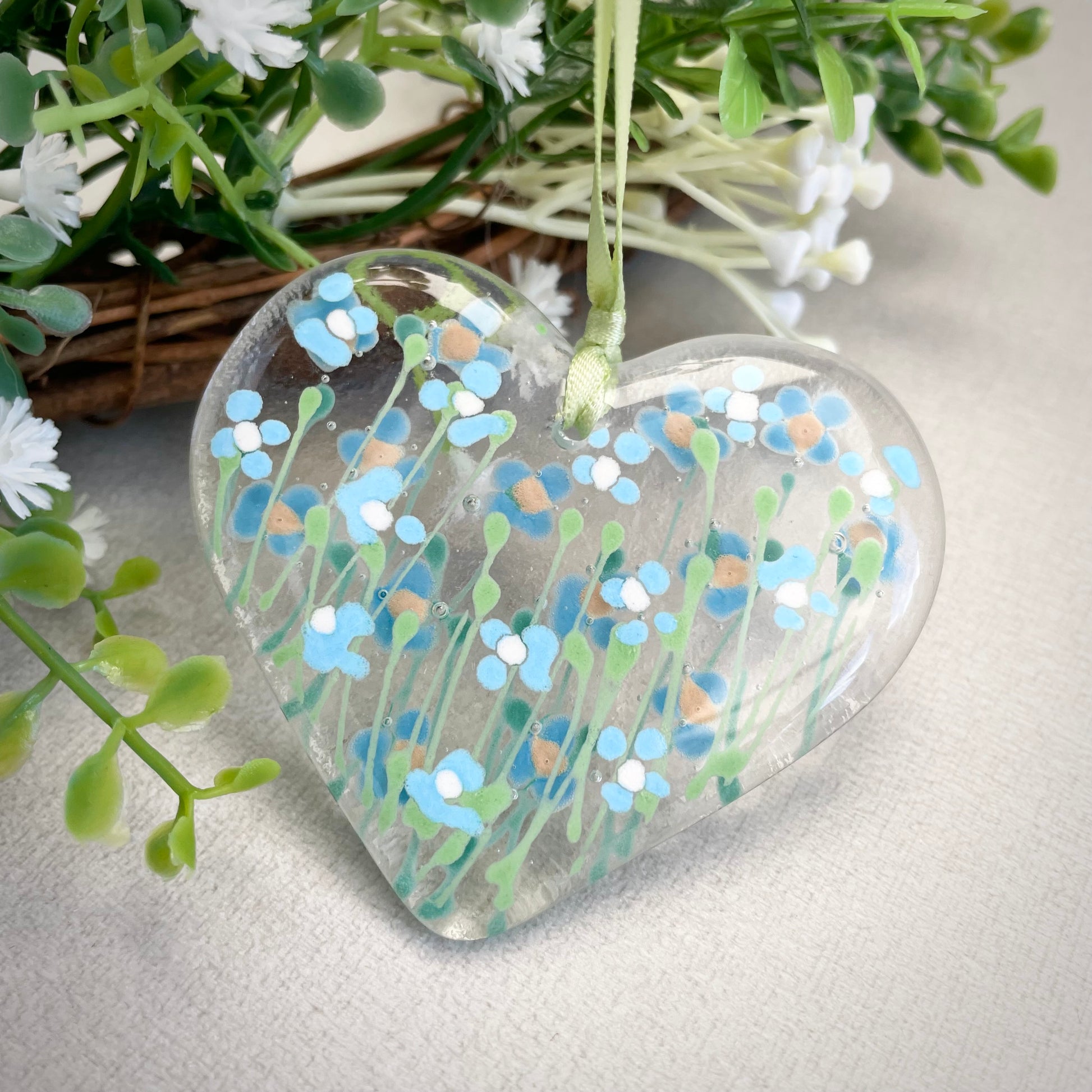 Gorgeous handmade glass heart, hand painted with pretty forget-me-nots ~ the layers make it appear slightly 3D