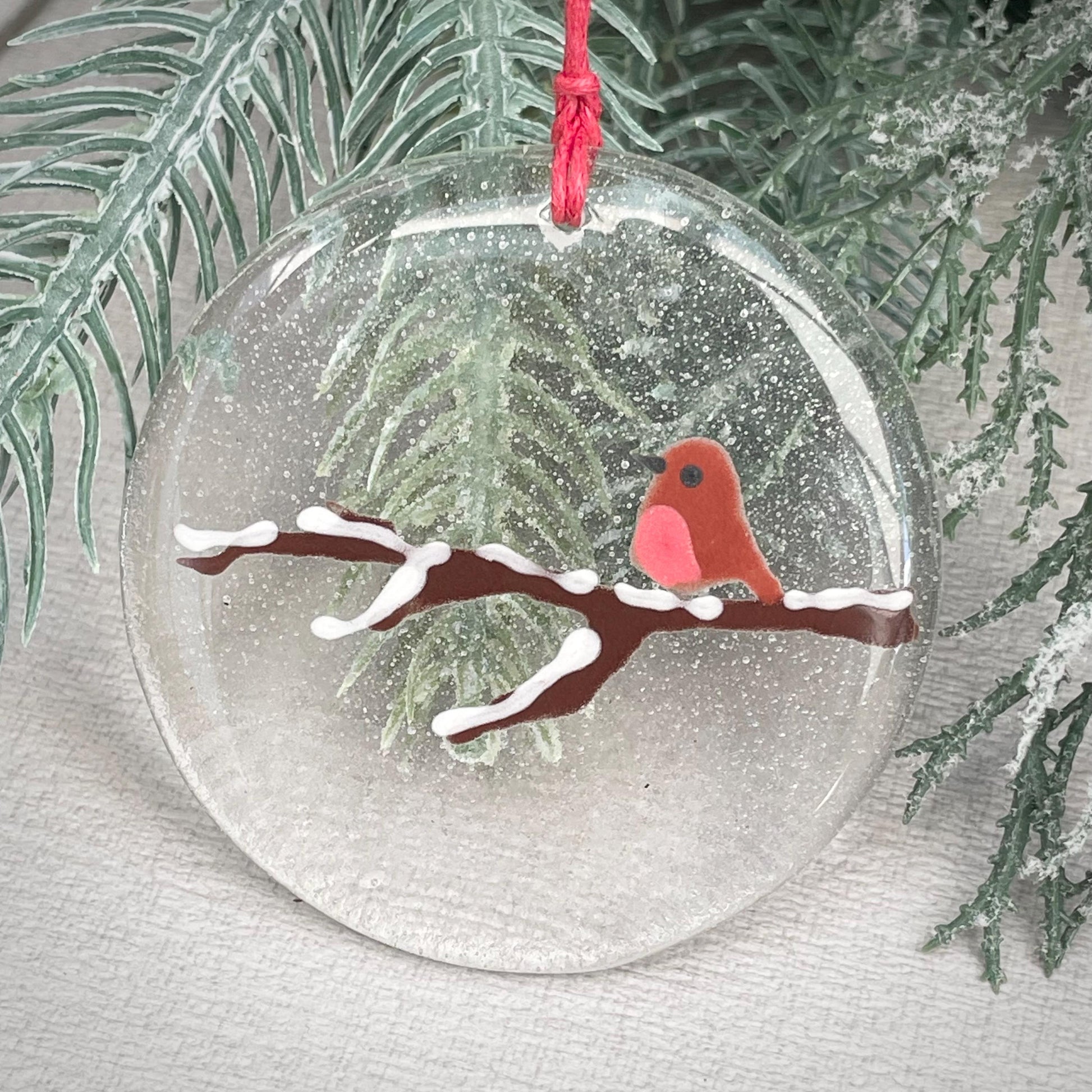 Cute little round hangers with a hand painted robin sat on a snowy branch, a lovely addition to the Christmas tree.