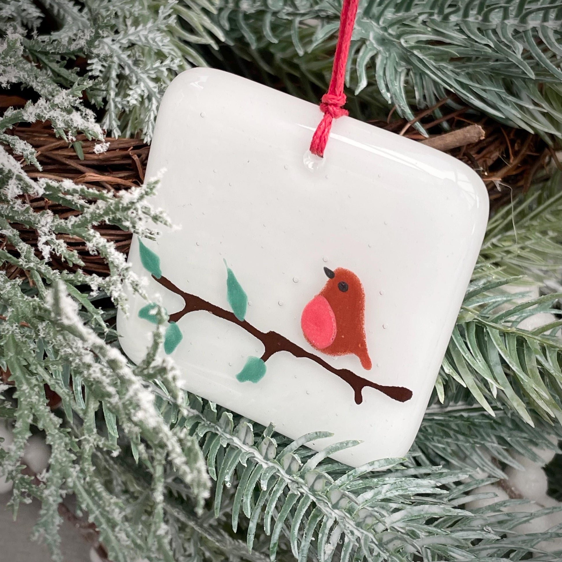 Cute little square hangers with a hand painted robin sat on a leafy branch, a lovely addition to the Christmas tree.